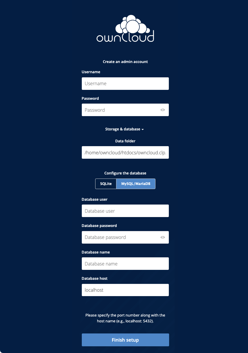 - Create a Database, open your site in the browser, and go through the Owncloud Installer.